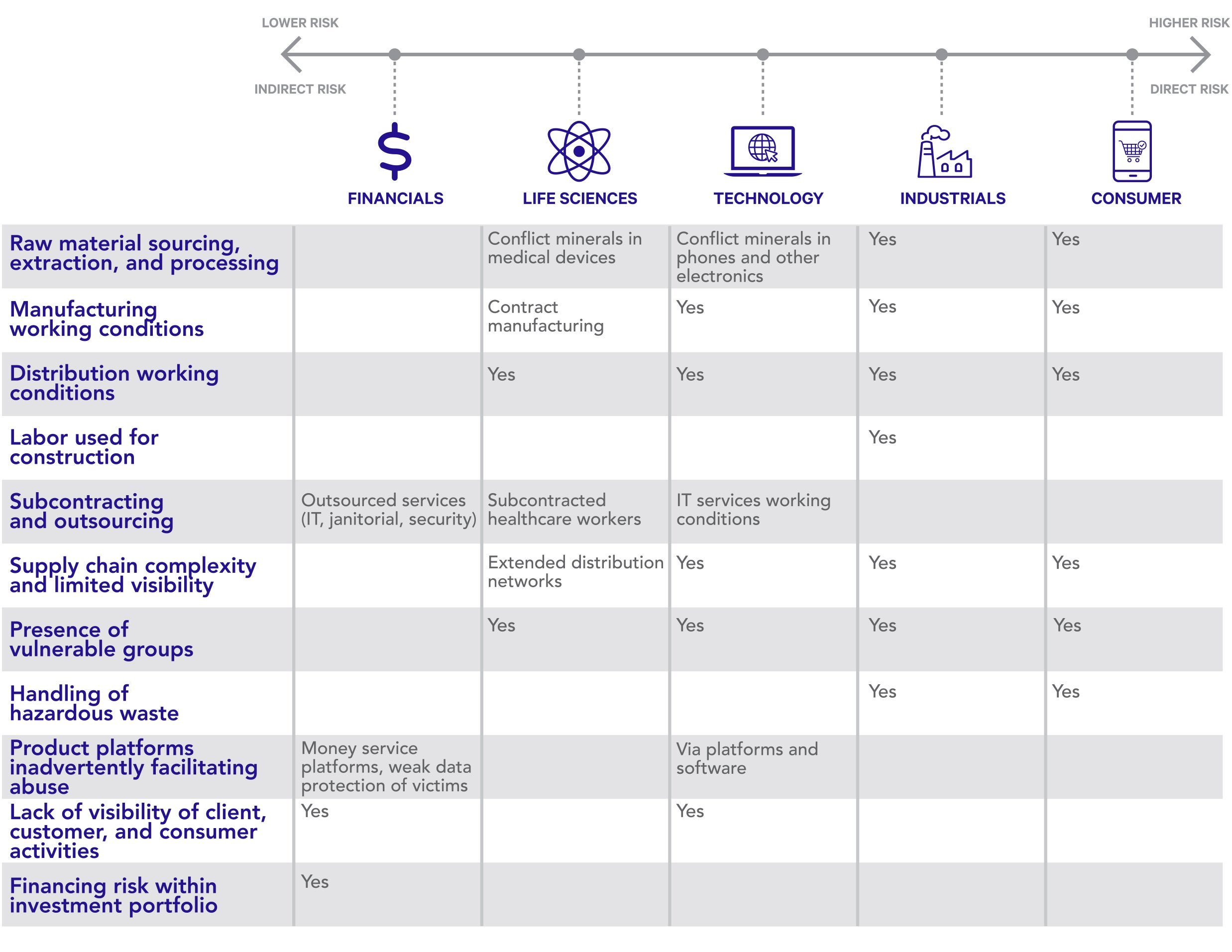 In addition to more visible risks, such as the widespread use of conflict minerals, human rights risks in the technology, life sciences, and financials sectors can also manifest in less obvious ways. Asset-light business models may still face significant exposure through hidden forms of exploitation, making such risks harder to detect but no less damaging.