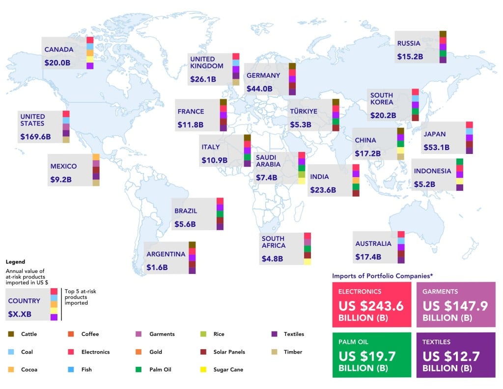 According to this data from Walk Free, the industrialized and emerging market countries of the G20 import more than $468 billion annually in goods at risk of being produced with forced labor—an inflation-adjusted increase of $61 billion since 2018. Top categories include electronics, garments, palm oil, solar panels, and textiles, many of which feature in our portfolio companies’ supply chains.15