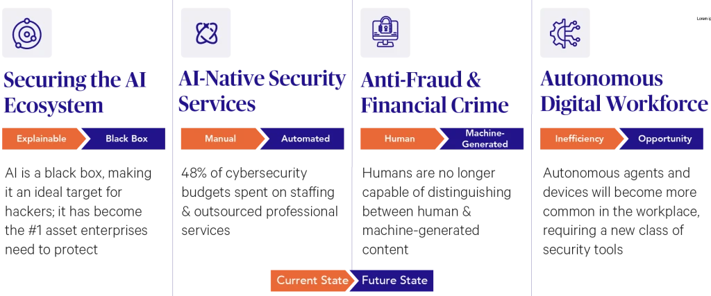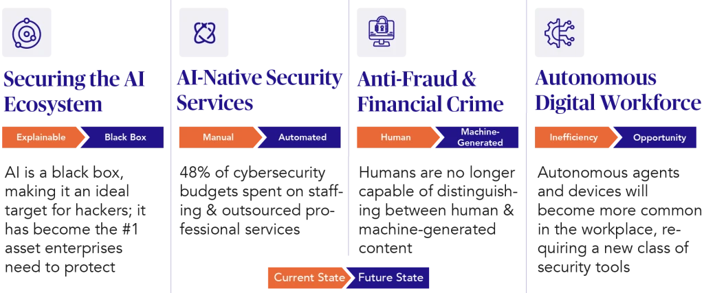 Within this labyrinth of cyber products, we are most excited about opportunities emerging at the intersection of AI and cybersecurity. Figure 2 shows a range of applications, from novel solutions that defend a new attack surface introduced by AI models to tools that automate the tedious, labor-intensive work involved in triaging and investigating cybersecurity incidents. Ultimately, as AI-driven attacks become more common, they will demand a new cybersecurity platform for defenders centered on speed, automation, and scale.